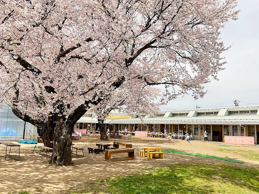 2026.04.13 お知らせ お花見給食をしました! 保育園の庭に何本もある桜の木が満開になりました🌸お天気も良かったので2歳以上のクラスは机をテラスやお庭に出して「お花見給食」をしました。桜を見ながら、開放的な給食はいつも以上に箸がすすんだ様子の子どもたちでした。