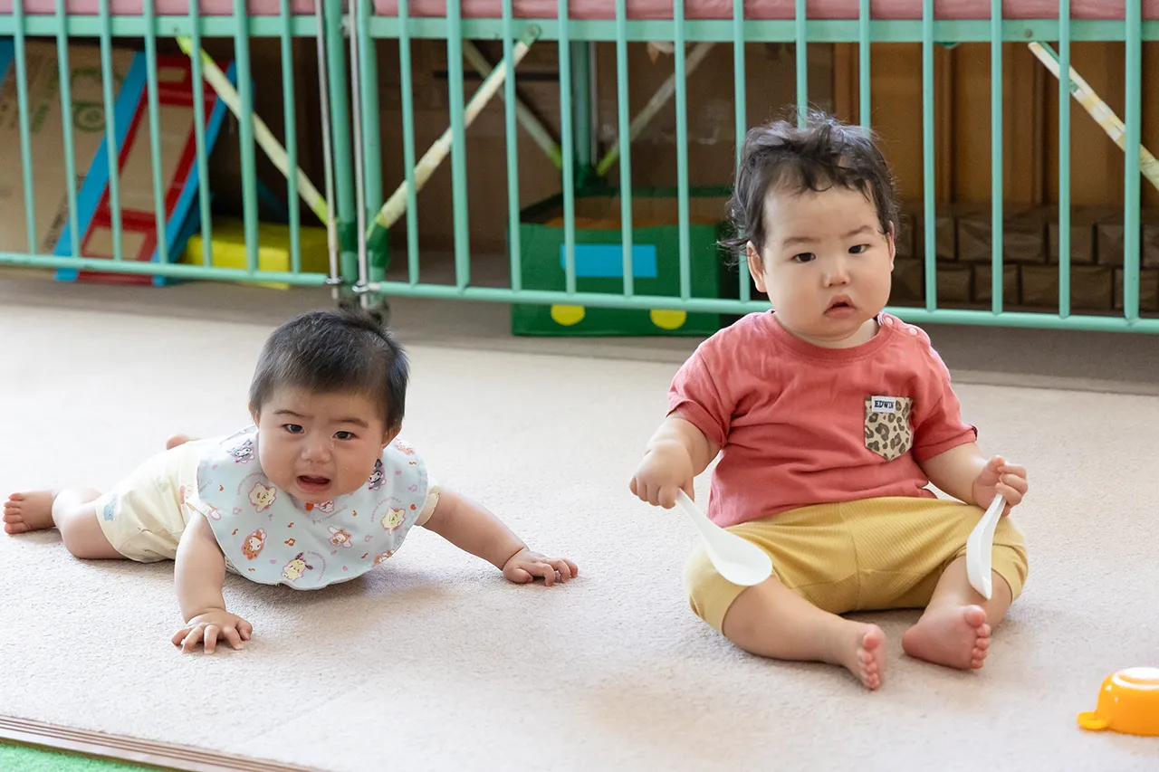保育園で一番小さい子どもたちのクラスです。ほふくスペースと食事スペースに分れており、個々の発達に合わせた生活を送っています。首が座ったお子さん(4か月頃)からお預かりしています。