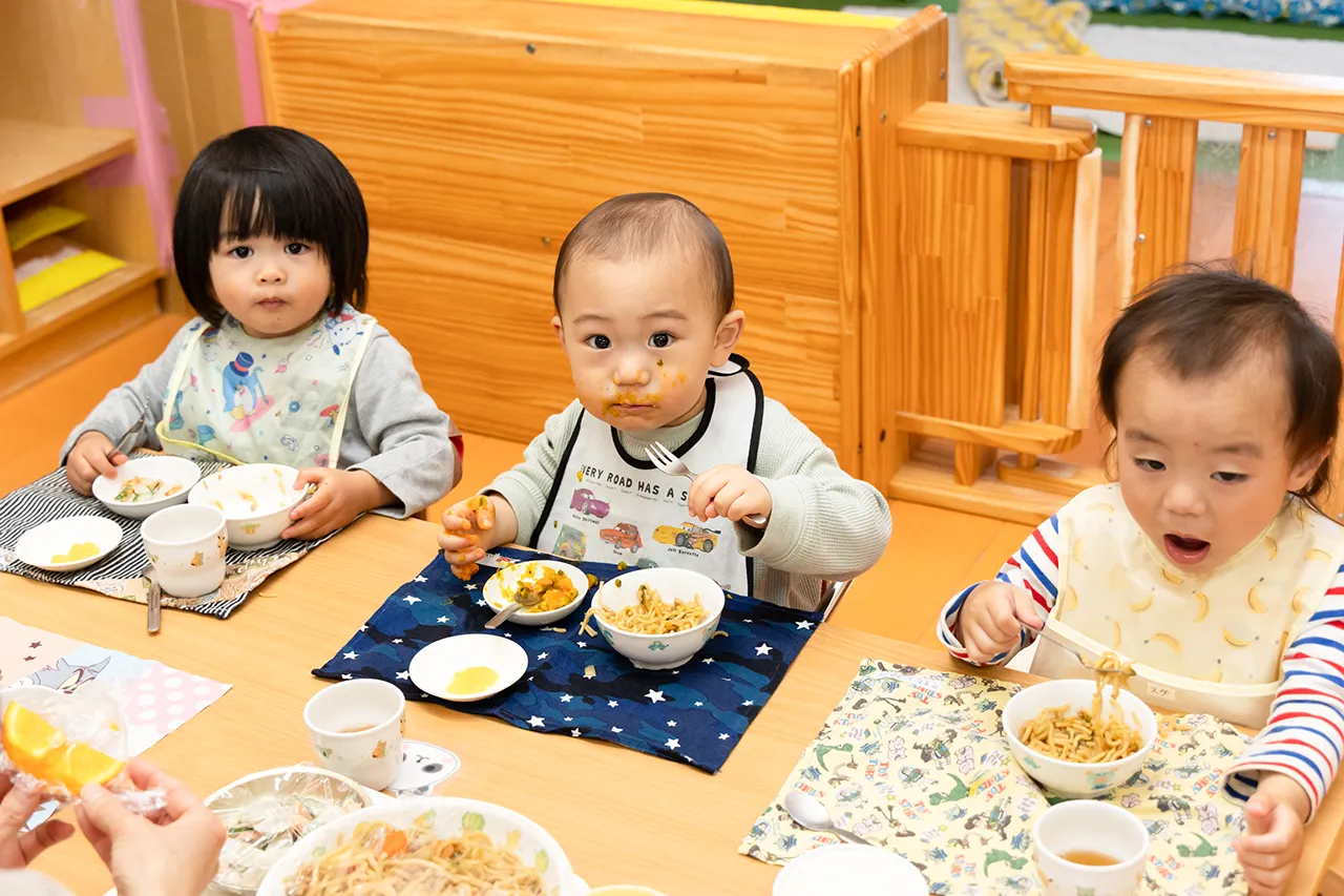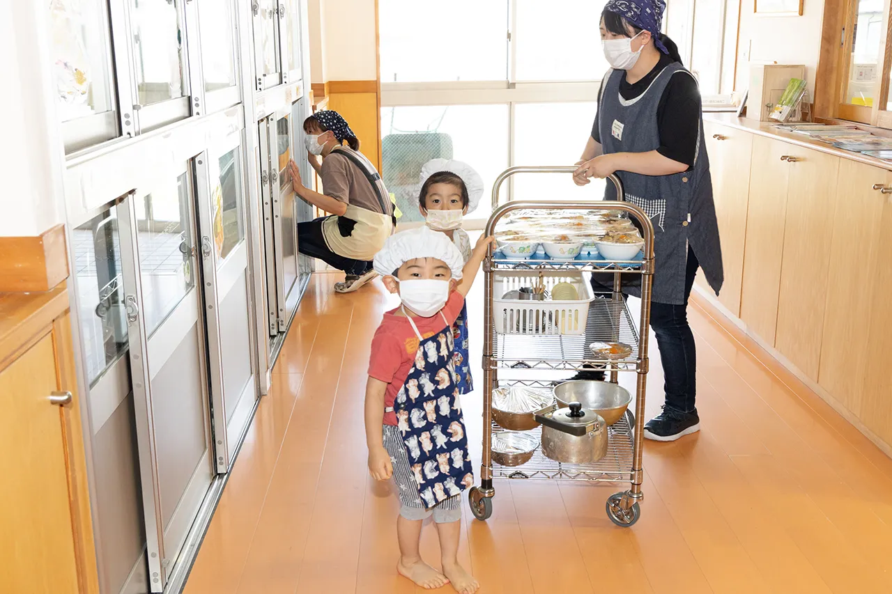 基本的生活習慣が身に付くように、手洗いや着替えの仕方、お昼寝の布団を敷くなど、生活に必要な様々な経験を自分で挑戦しています。給食の当番活動が始まります。