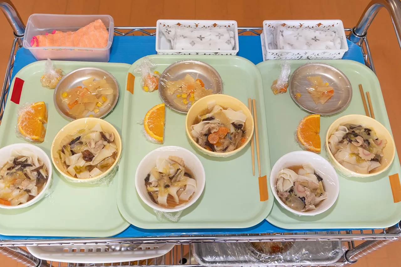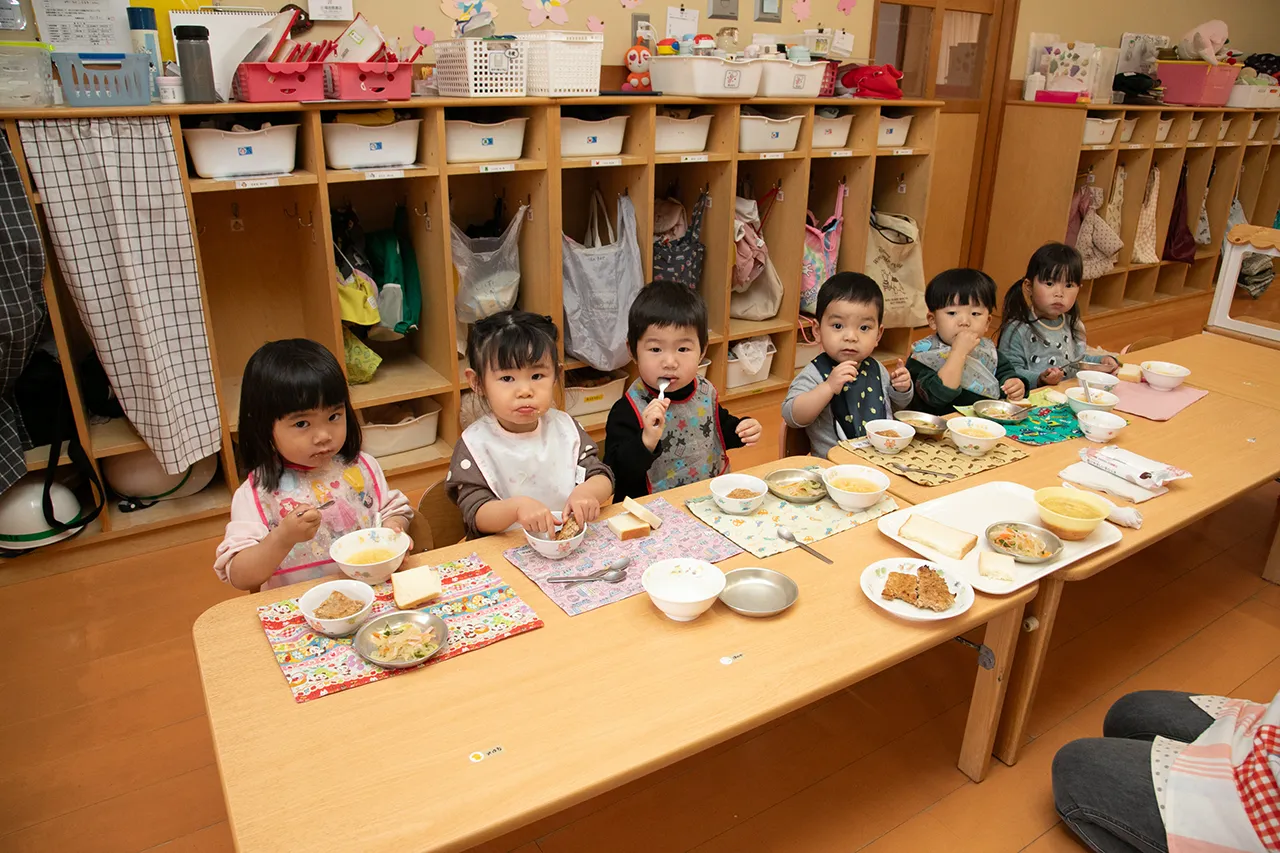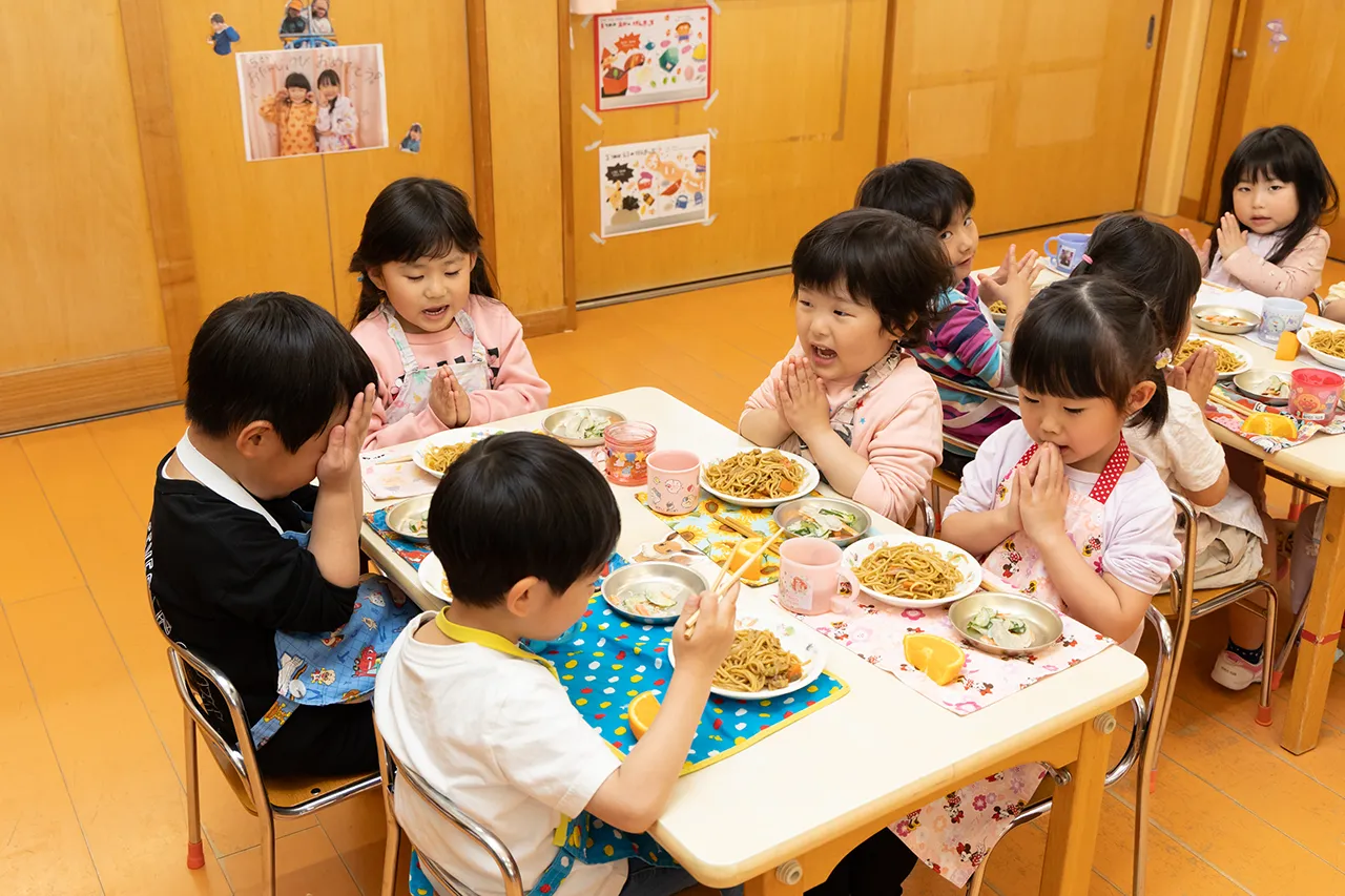 園では、栄養士が工夫を凝らした、できたての給食を毎日提供しています。和食を中心に、季節の食材や郷土料理を取り入れ、素材の味を大切にした献立です。子どもたちの発育や発達状態に合わせた食事で、楽しく食べる力を育んでいます。