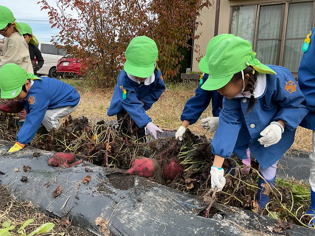 おじいちゃんおばあちゃんとさつまいもを育てて、秋には焼きいも会をしています。1年間の畑作りを通して世代間交流を行っています。