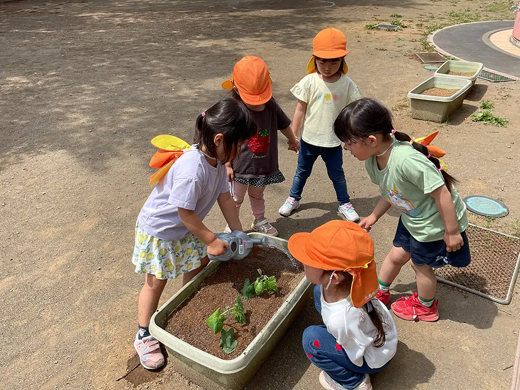 お部屋の前のプランターでも野菜作りをしました。おおきくな〜れ!